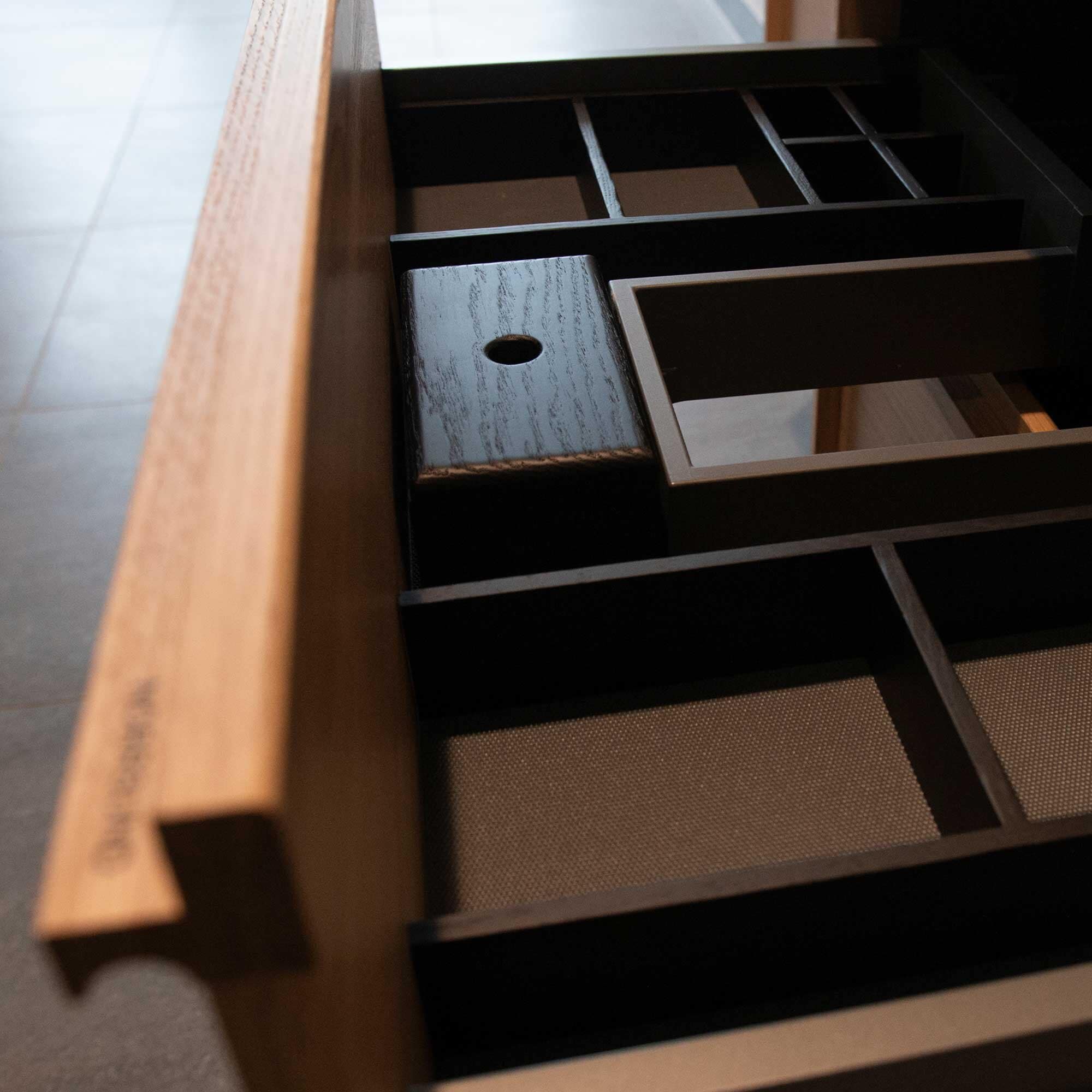 Förvaring går det aldrig att få för mycket av, se därför till att inred dina lådor med vår snygga träinredning i svartbetsad ek. De funktionella avdelarna och asken med lock ger ett lyxigt utryck.