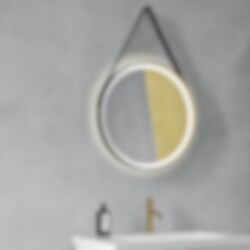 Ramen är gjord i solid aluminium som lackerats svart på utsidan och guld på insidan. Remmen är i konstläder för att tåla en utsatt badrumsmiljö på bästa sätt.